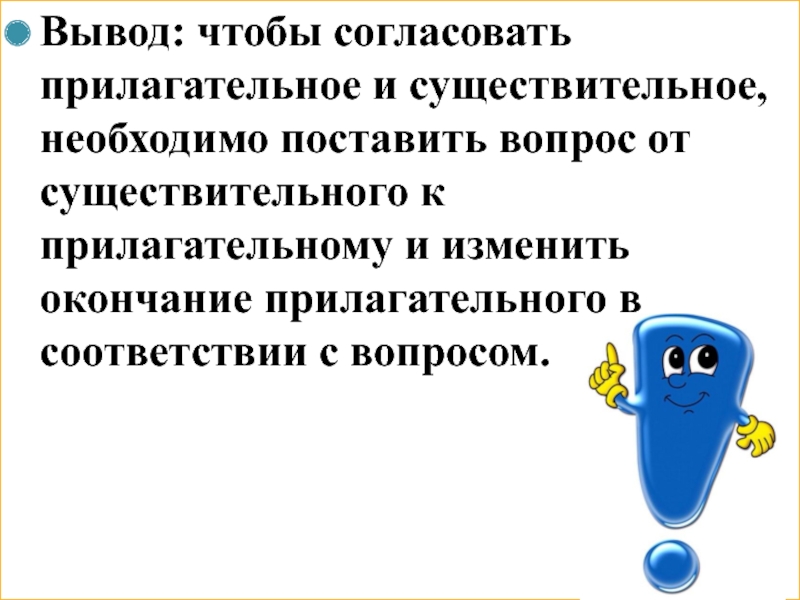 Слайд 4Вывод: чтобы согласовать прилагательное и существительное, необходимо поставить вопрос от существительного