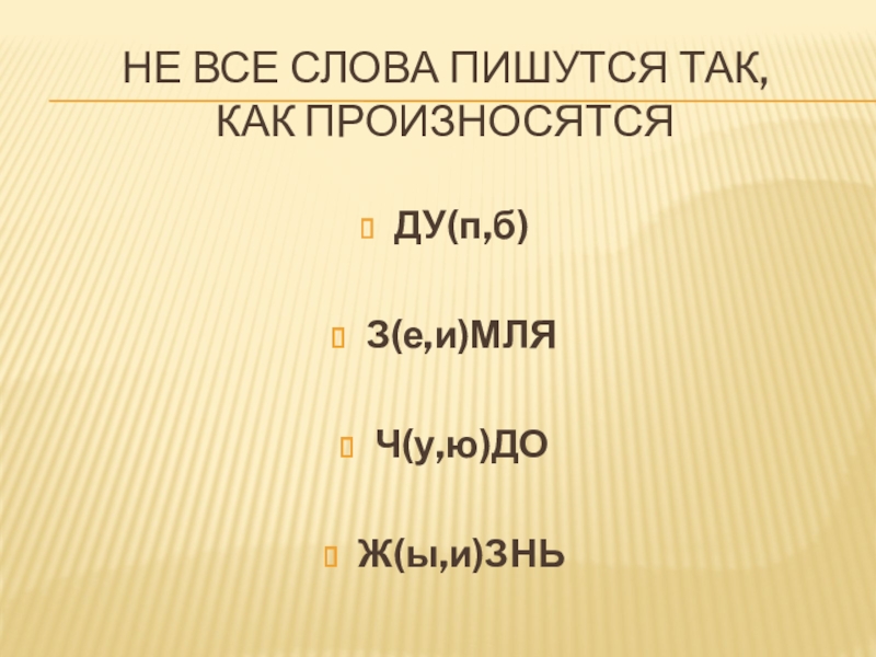 Не все слова пишутся так,  как произносятсяДУ(п,б)З(е,и)МЛЯЧ(у,ю)ДОЖ(ы,и)ЗНЬ