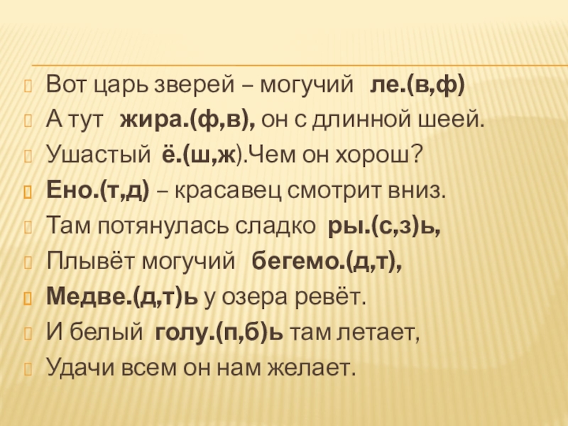 Вот царь зверей – могучий  ле.(в,ф)А тут  жира.(ф,в), он с длинной шеей.Ушастый ё.(ш,ж).Чем он хорош?Ено.(т,д)