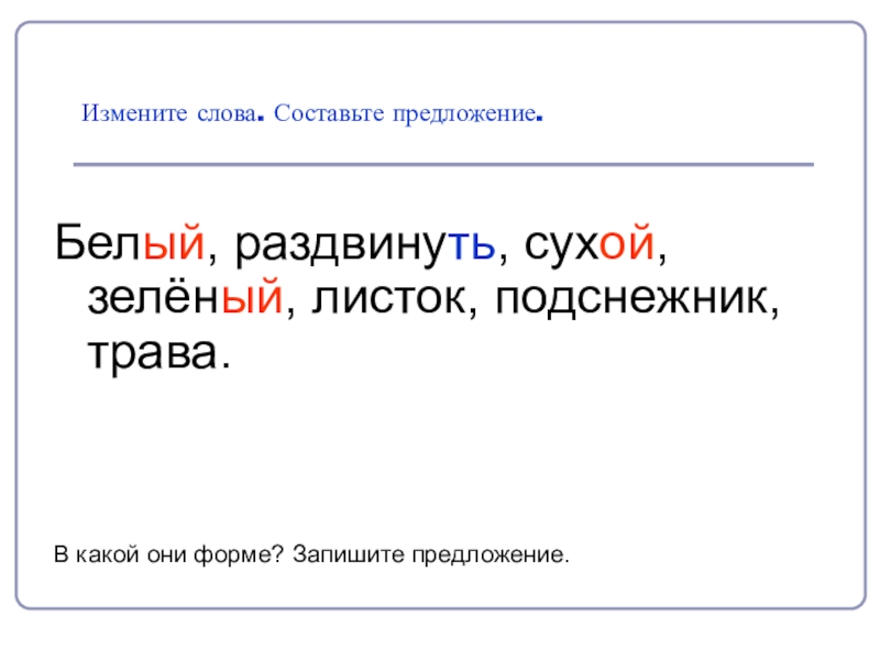 Измените слова. Составьте предложение. Белый, раздвинуть, сухой, зелёный, листок, подснежник, трава.В какой они форме? Запишите предложение.
