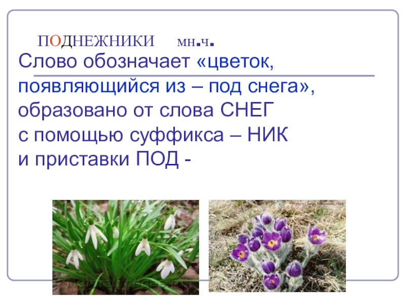 ПОДНЕЖНИКИ  мн.ч. Слово обозначает «цветок, появляющийся из – под снега»,образовано от слова СНЕГс помощью суффикса –