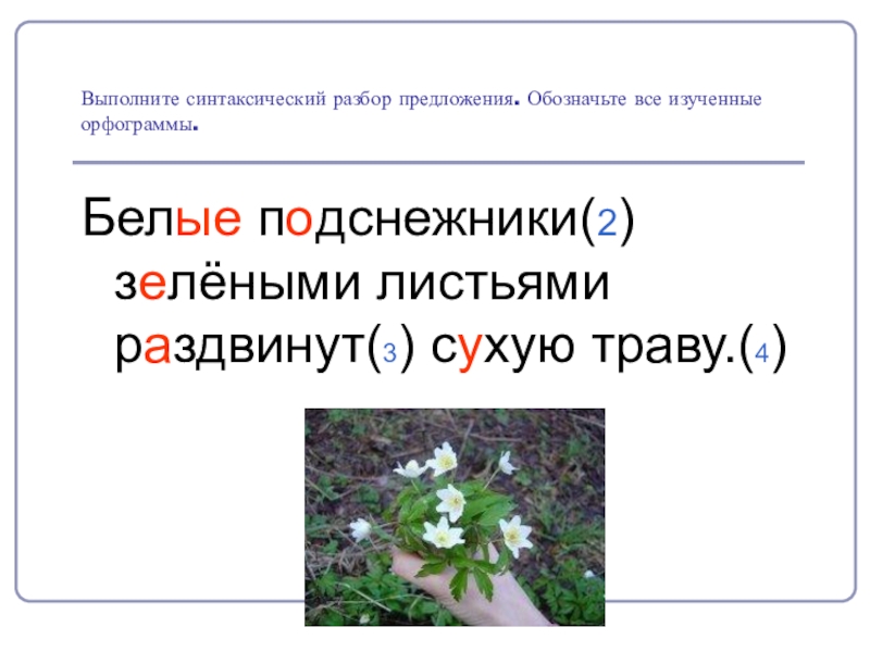 Выполните синтаксический разбор предложения. Обозначьте все изученные орфограммы.Белые подснежники(2) зелёными листьями раздвинут(3) сухую траву.(4)