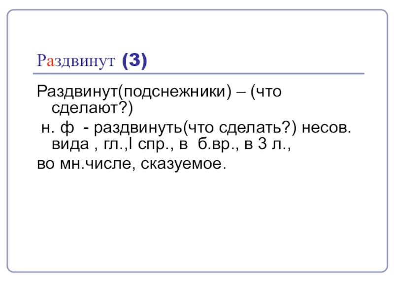 Раздвинут (3) Раздвинут(подснежники) – (что сделают?) н. ф - раздвинуть(что сделать?) несов.вида , гл.,I спр., в б.вр.,