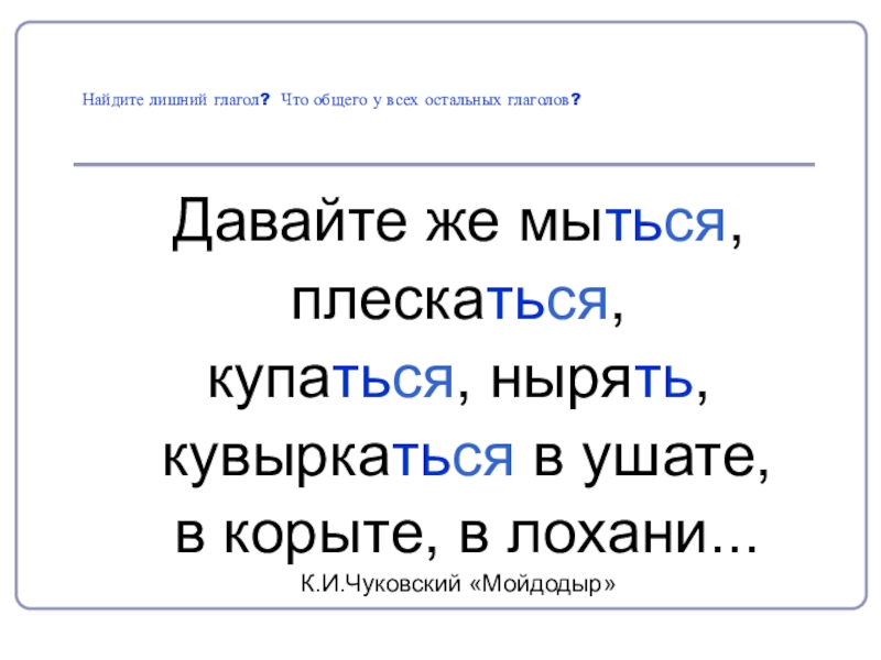 Найдите лишний глагол? Что общего у всех остальных глаголов?Давайте же мыться, плескаться,купаться, нырять, кувыркаться в ушате, в
