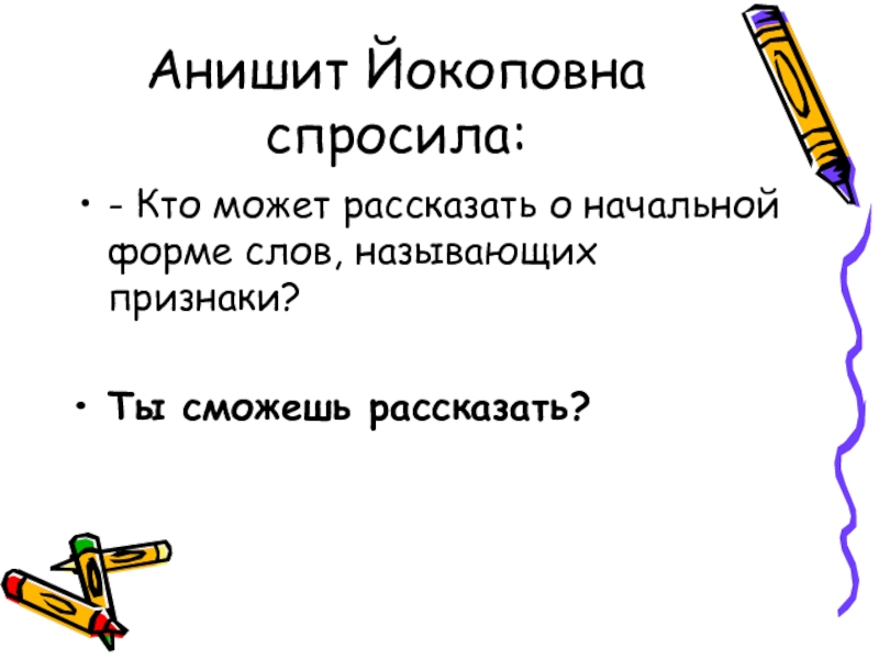 Анишит Йокоповна спросила:- Кто может рассказать о начальной форме слов, называющих признаки?Ты сможешь рассказать?