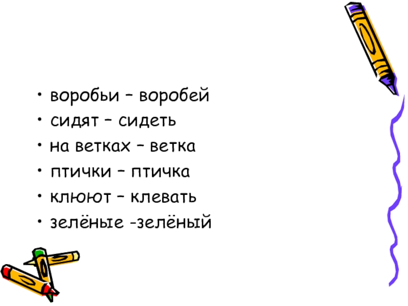 воробьи – воробейсидят – сидетьна ветках – веткаптички – птичкаклюют – клеватьзелёные -зелёный