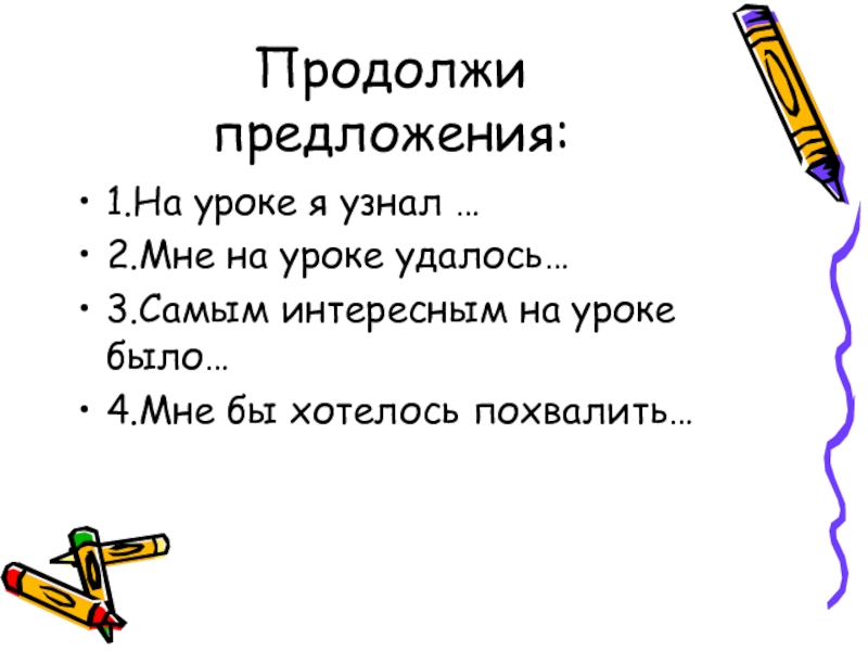 Продолжи предложения:1.На уроке я узнал …2.Мне на уроке удалось…3.Самым интересным на уроке было…4.Мне бы хотелось похвалить…