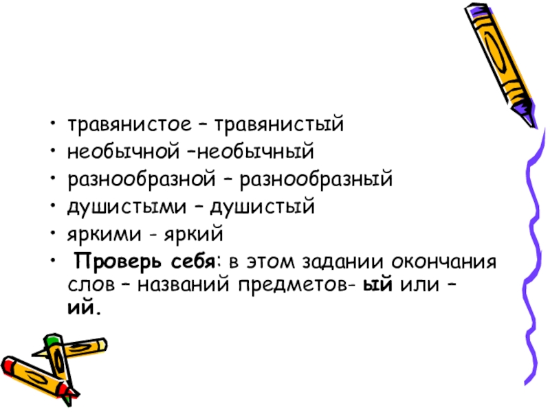 травянистое – травянистыйнеобычной –необычныйразнообразной – разнообразныйдушистыми – душистыйяркими - яркий Проверь себя: в этом задании окончания слов