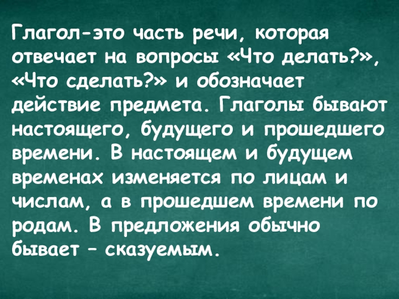 и обозначает действие предмета. Глаголы бывают настоящего, будущего и прошедшего времени. В настоящем и будущем временах изменяется по лицам и числам, а в прошедшем времени по родам. В предложения обычно бывает – сказуемым.
