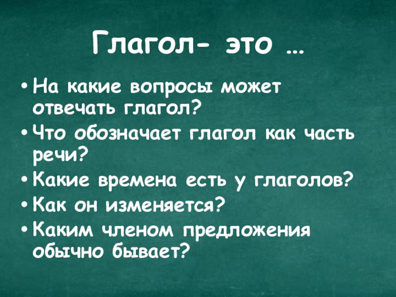 Глагол- это …На какие вопросы может отвечать глагол?Что обозначает глагол как часть речи?Какие времена есть у глаголов?Как он изменяется?Каким членом предложения обычно бывает?