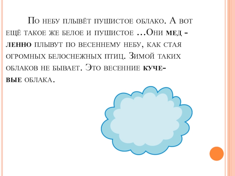 такое же белое и пушистое …Они мед - ленно плывут по весеннему небу, как стая огромных белоснежных птиц. Зимой таких облаков не бывает. Это весенние куче- вые облака.