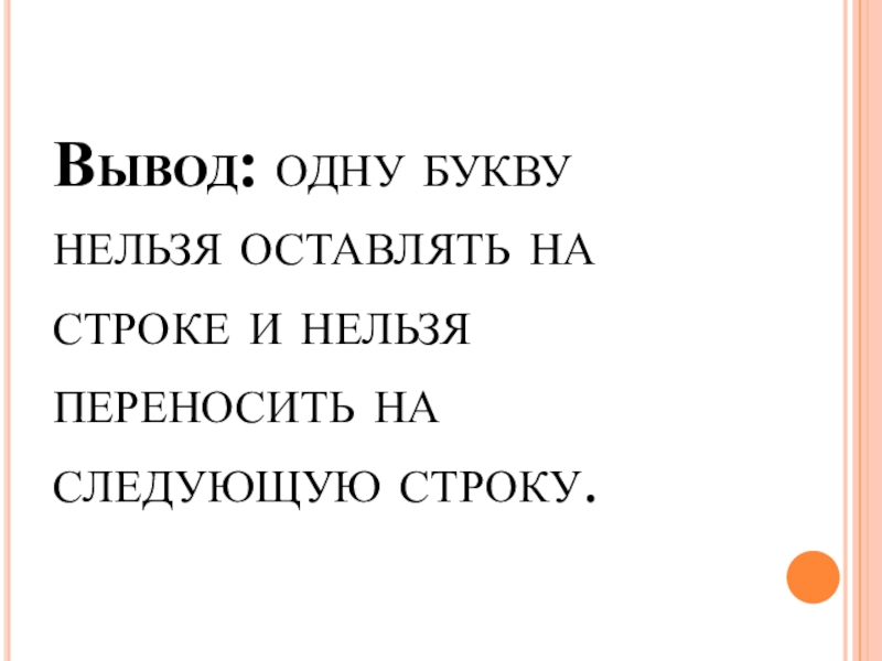 Слайд 7Вывод: одну букву нельзя оставлять на строке и нельзя переносить на