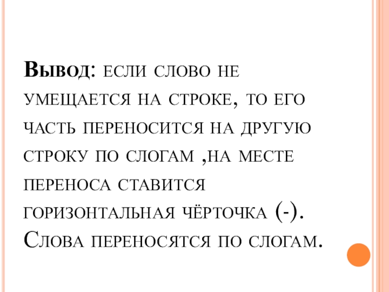 Слайд 4Вывод: если слово не умещается на строке, то его часть переносится