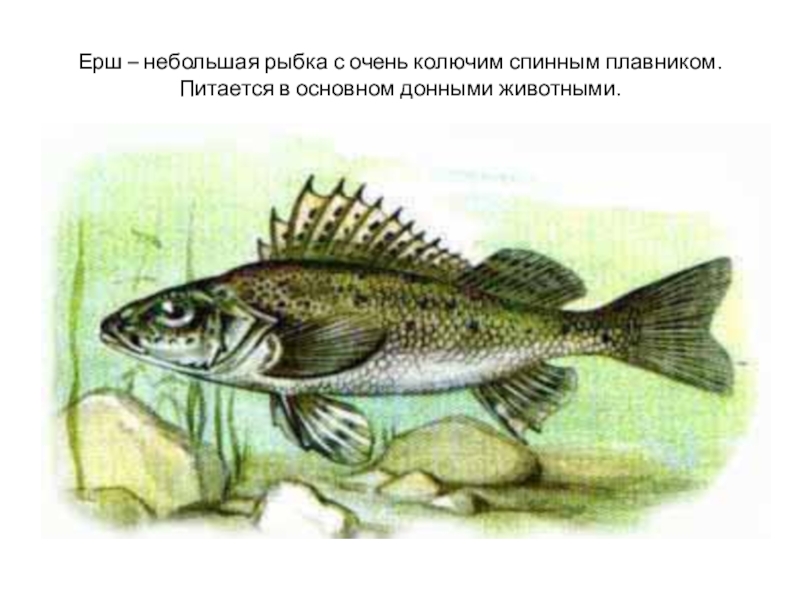 Слайд 2Ерш – небольшая рыбка с очень колючим спинным плавником. Питается в основном
