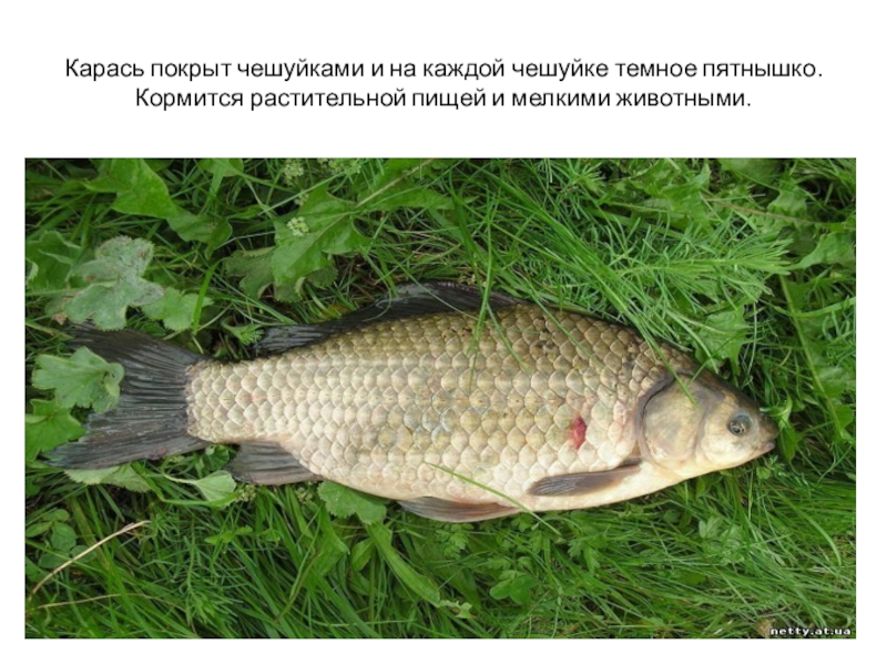 Слайд 5Карась покрыт чешуйками и на каждой чешуйке темное пятнышко. Кормится растительной
