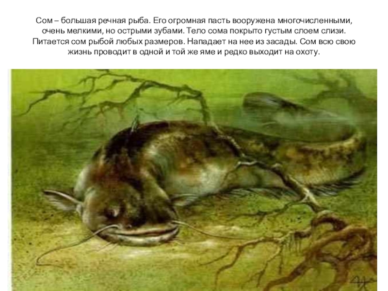 Слайд 4Сом – большая речная рыба. Его огромная пасть вооружена многочисленными, очень