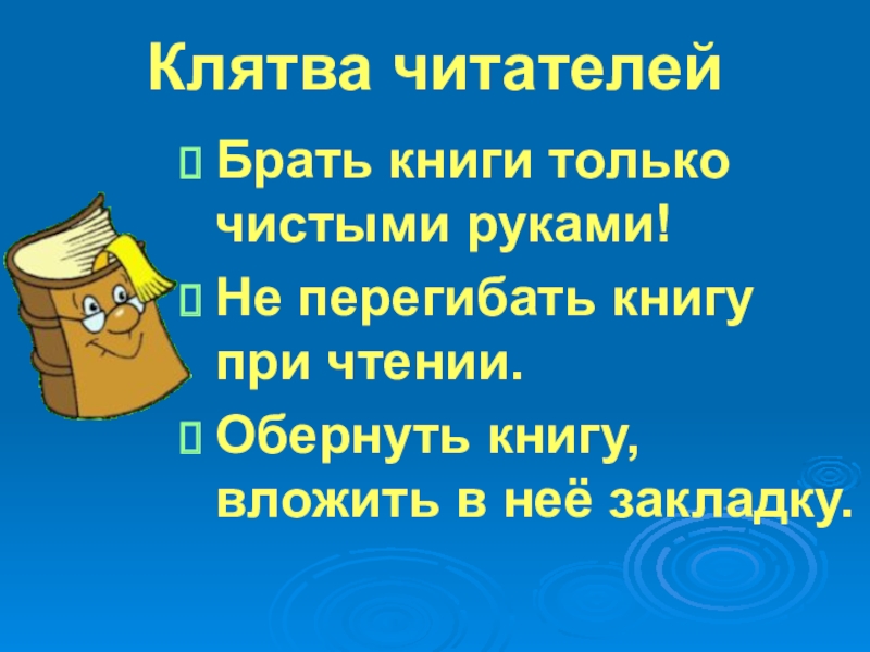 Клятва читателейБрать книги только чистыми руками!Не перегибать книгу при чтении.Обернуть книгу, вложить в неё закладку.