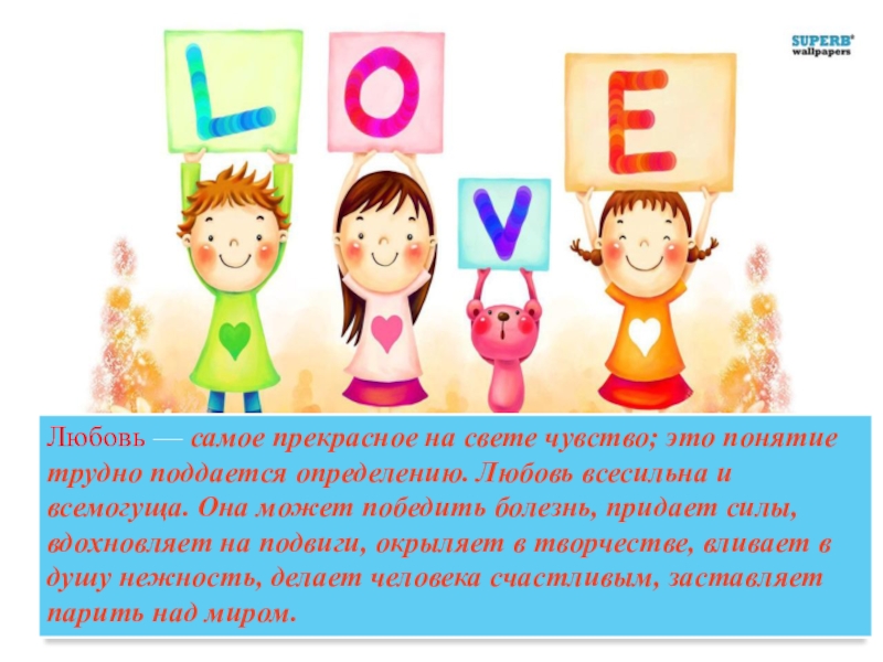 Слайд 6Любовь — самое прекрасное на свете чувство; это понятие трудно поддается