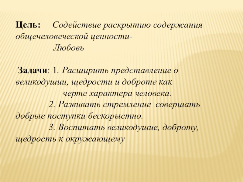 Задачи: 1. Расширить представление о великодушии, щедрости и доброте как