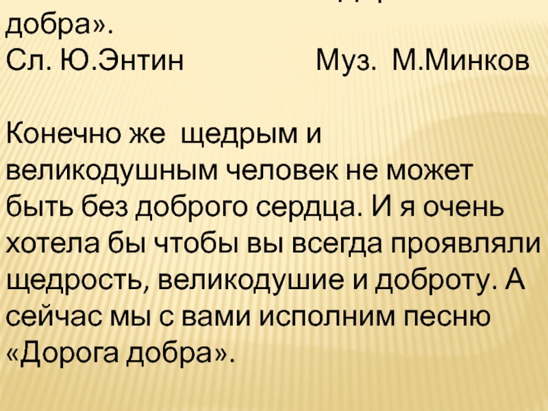 Конечно же щедрым и великодушным человек не может быть без доброго сердца. И я очень хотела бы чтобы вы всегда проявляли щедрость, великодушие и доброту. А сейчас мы с вами исполним песню «Дорога добра».