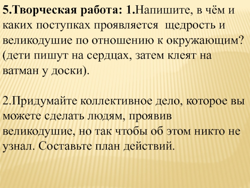 2.Придумайте коллективное дело, которое вы можете сделать людям, проявив великодушие, но так чтобы об этом никто не узнал. Составьте план действий.