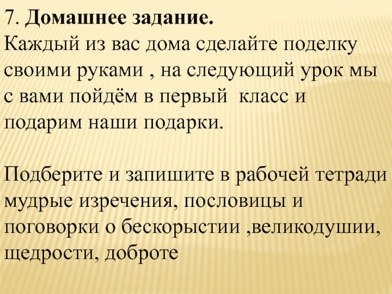 - Отдавать людям то, чем ты дорожишь, отдавать охотно, не думая о награде, похвале или ответном даре, не заботясь о том, как распорядятся твоим подарком, может только духовно богатый – великодушный человек!