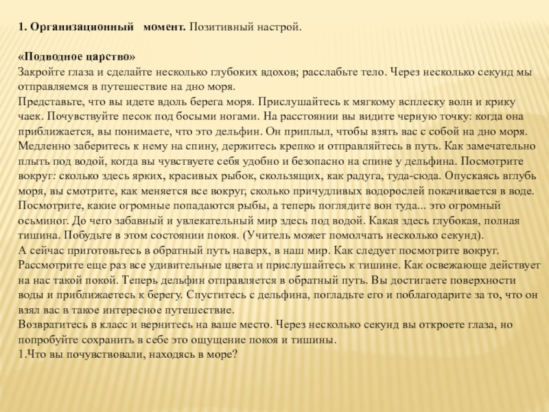 Представьте, что вы идете вдоль берега моря. Прислушайтесь к мягкому всплеску волн и крику чаек. Почувствуйте песок под босыми ногами. На расстоянии вы видите черную точку: когда она приближается, вы понимаете, что это дельфин. Он приплыл, чтобы взять вас с собой на дно моря. Медленно заберитесь к нему на спину, держитесь крепко и отправляйтесь в путь. Как замечательно плыть под водой, когда вы чувствуете себя удобно и безопасно на спине у дельфина. Посмотрите вокруг: сколько здесь ярких, красивых рыбок, скользящих, как радуга, туда-сюда. Опускаясь вглубь моря, вы смотрите, как меняется все вокруг, сколько причудливых водорослей покачивается в воде. Посмотрите, какие огромные попадаются рыбы, а теперь поглядите вон туда... это огромный осьминог. До чего забавный и увлекательный мир здесь под водой. Какая здесь глубокая, полная тишина. Побудьте в этом состоянии покоя. (Учитель может помолчать несколько секунд).