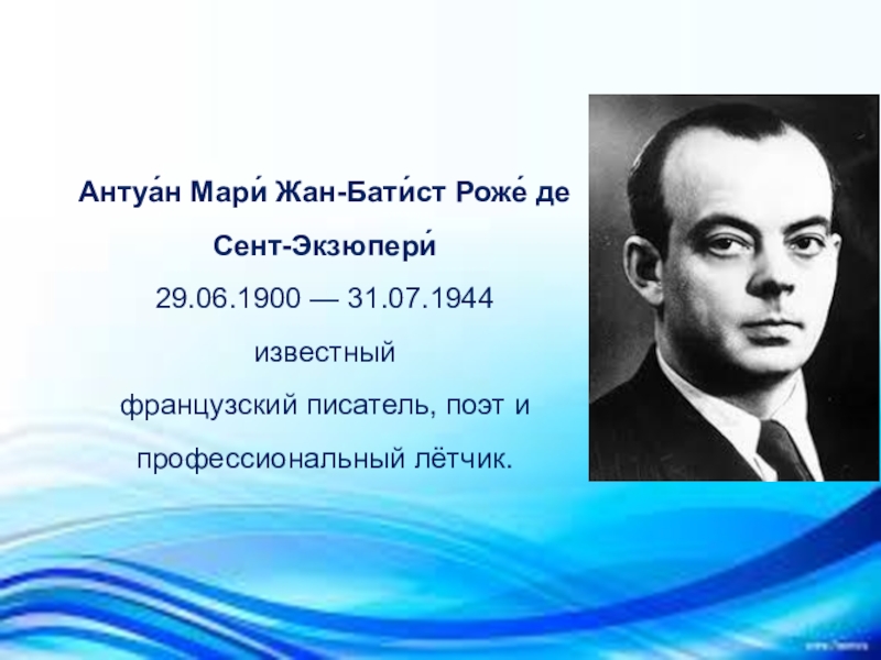 Антуа́н Мари́ Жан-Бати́ст Роже́ де Сент-Экзюпери́  29.06.1900 — 31.07.1944 известный французский писатель, поэт и профессиональный лётчик.
