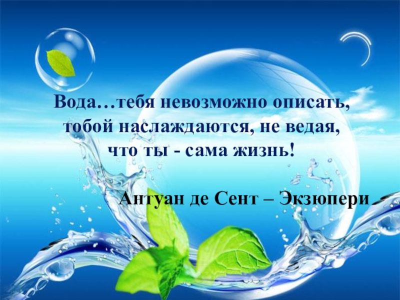 Слайд 4Вода…тебя невозможно описать, тобой наслаждаются, не ведая,