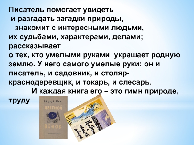 Писатель помогает увидеть и разгадать загадки природы,  знакомит с интересными людьми, их судьбами, характерами, делами; рассказывает