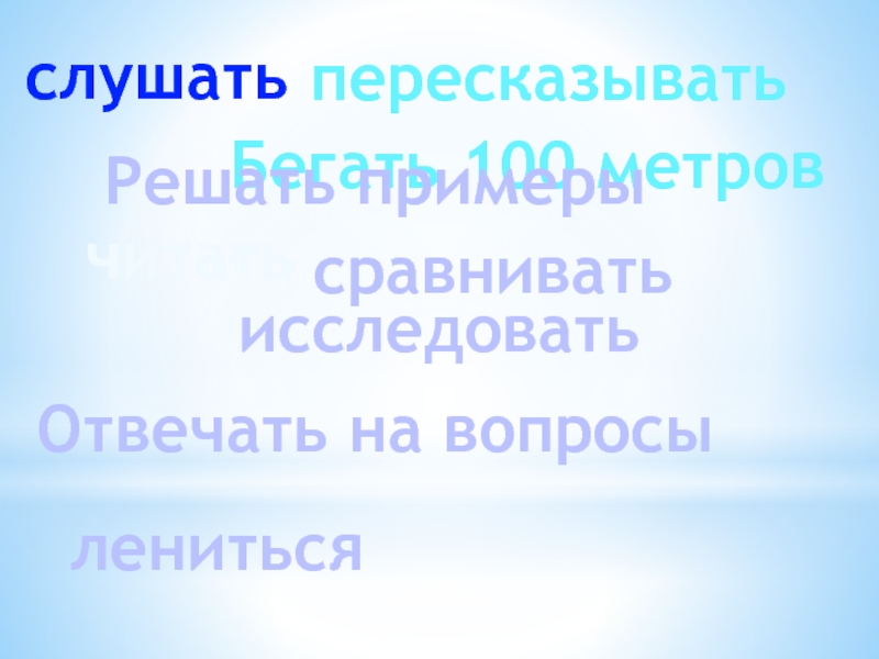 слушатьБегать 100 метровчитатьпересказыватьОтвечать на вопросысравниватьисследоватьРешать примерылениться