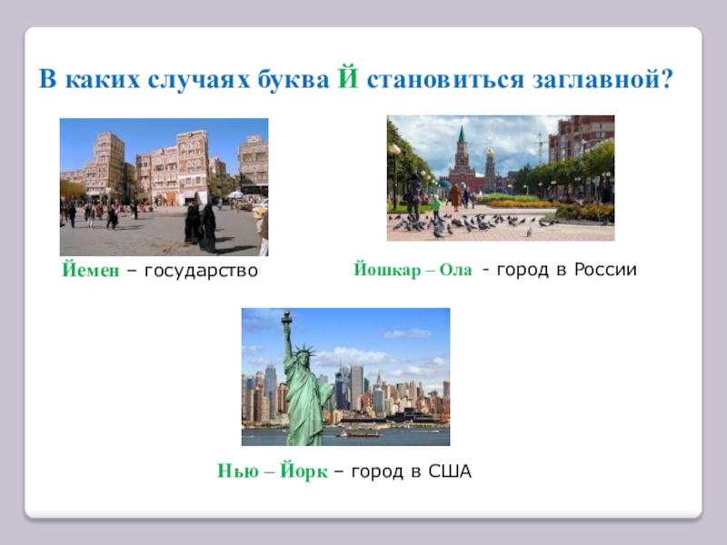 В каких случаях буква Й становиться заглавной?Йемен – государство Йошкар – Ола - город в России Нью