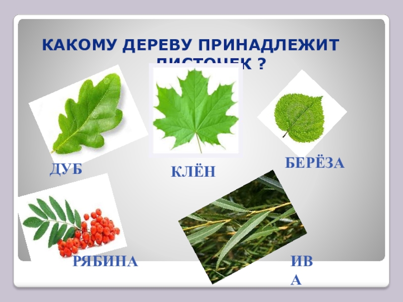 какому дереву принадлежит листочек ?ДУБКЛЁНБЕРЁЗАРЯБИНАИВА