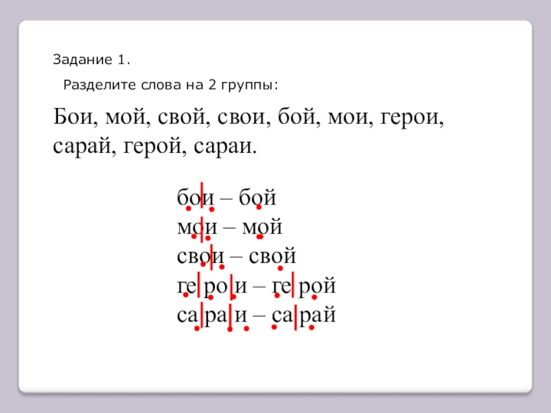Задание 1. Разделите слова на 2 группы:Бои, мой, свой, свои, бой, мои, герои, сарай, герой, сараи.бои –