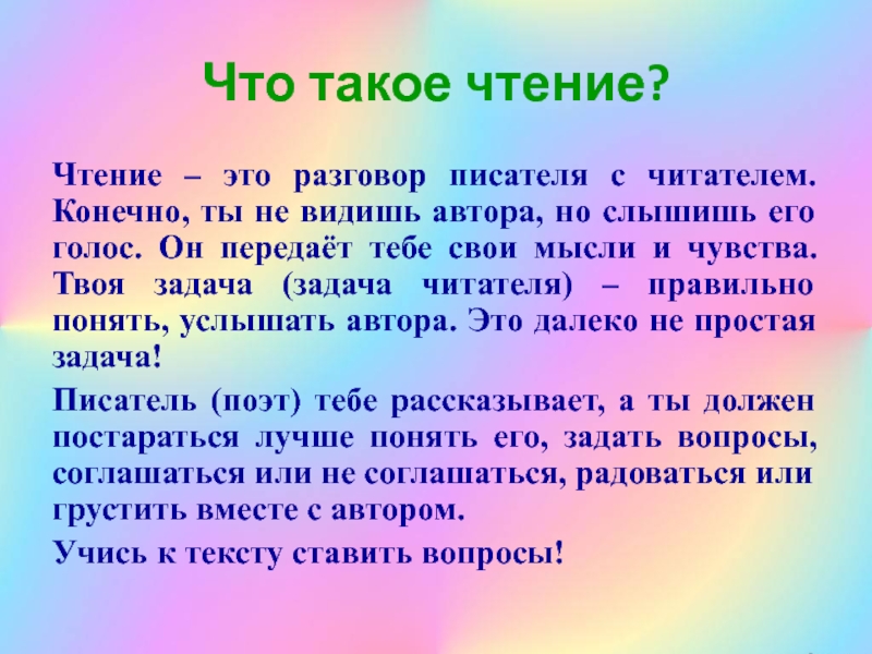 Что такое чтение?Чтение – это разговор писателя с читателем. Конечно, ты не видишь автора, но слышишь его