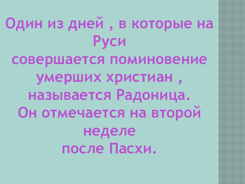 Один из дней , в которые на Руси совершается поминовение умерших христиан , называется Радоница.Он отмечается на