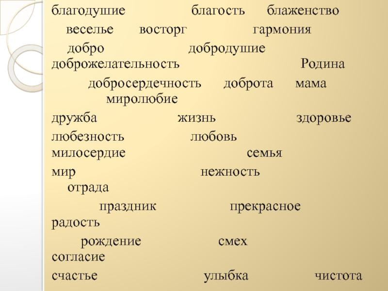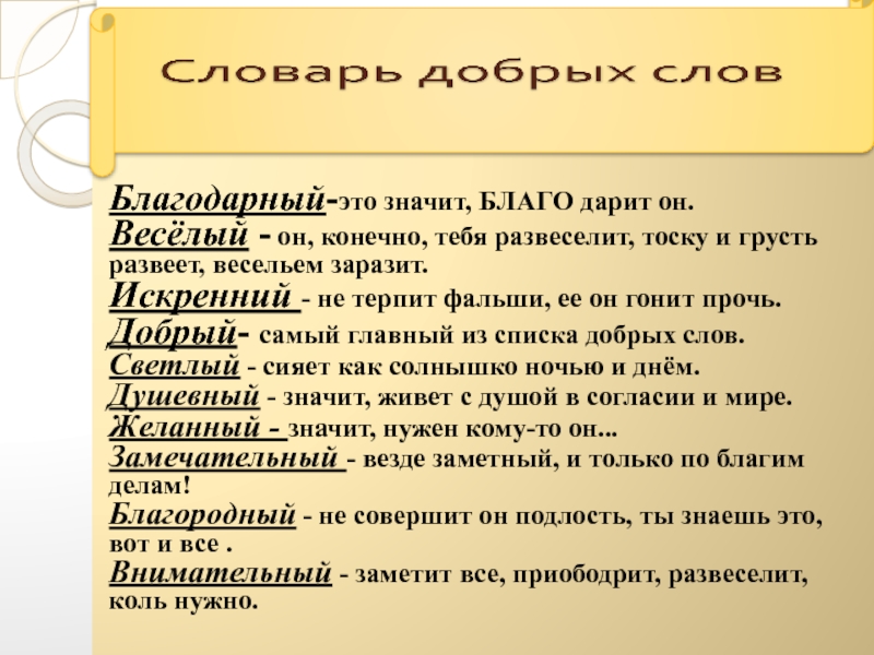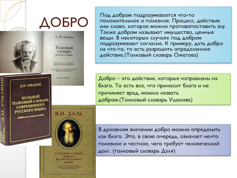 В духовном значении добро можно определить как благо. Это, в свою очередь, означает нечто полезное и честное, чего требует человеческий долг. (толковый словарь Даля)