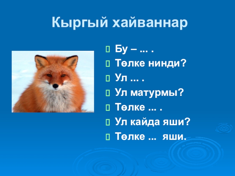 Кыргый хайваннарБу – төлке.Төлке нинди?Ул хәйләкәр.Ул матурмы?Төлке матур.Ул кайда яши?Төлке урманда яши.