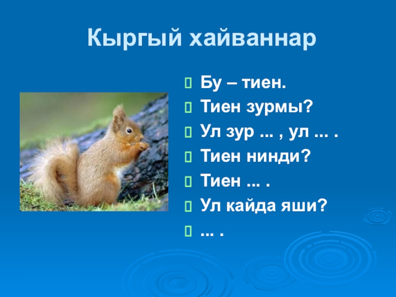 Кыргый хайваннарБу – тиен.Тиен зурмы?Ул зур ... , ул ... .Тиен нинди?Тиен ... .Ул кайда яши?... .