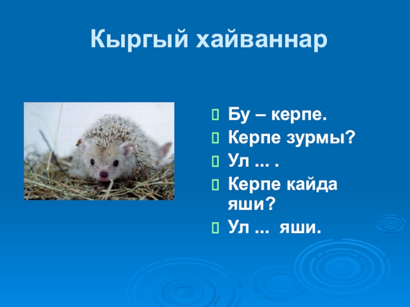 Кыргый хайваннарБу – керпе.Керпе зурмы?Ул ... .Керпе кайда яши?Ул ... яши.