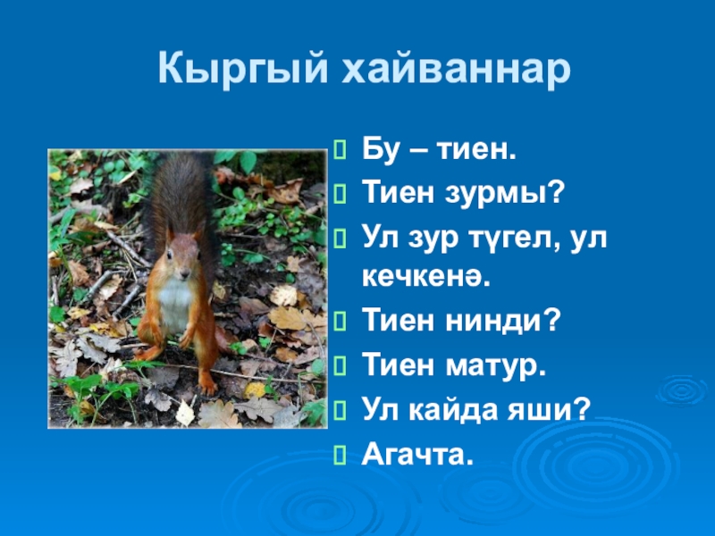 Кыргый хайваннарБу – тиен.Тиен зурмы?Ул зур түгел, ул кечкенә.Тиен нинди?Тиен матур.Ул кайда яши?Агачта.