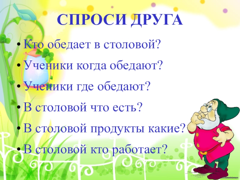 СПРОСИ ДРУГАКто обедает в столовой?Ученики когда обедают?Ученики где обедают?В столовой что есть?В столовой продукты какие?В столовой