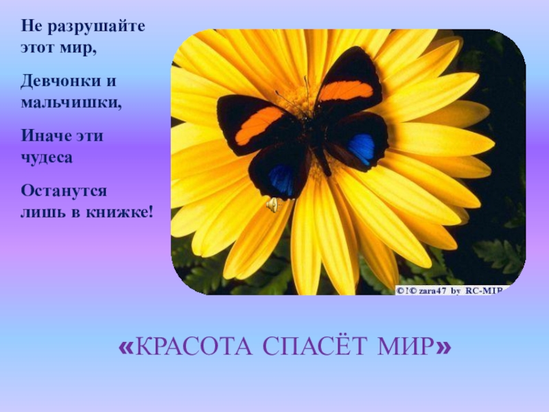 «КРАСОТА СПАСЁТ МИР»Не разрушайте этот мир,Девчонки и мальчишки,Иначе эти чудесаОстанутся лишь в книжке!