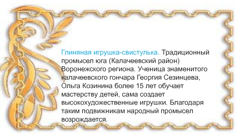 Слайд 10Глиняная игрушка-свистулька. Традиционный промысел юга (Калачеевский район) Воронежского региона. Ученица знаменитого