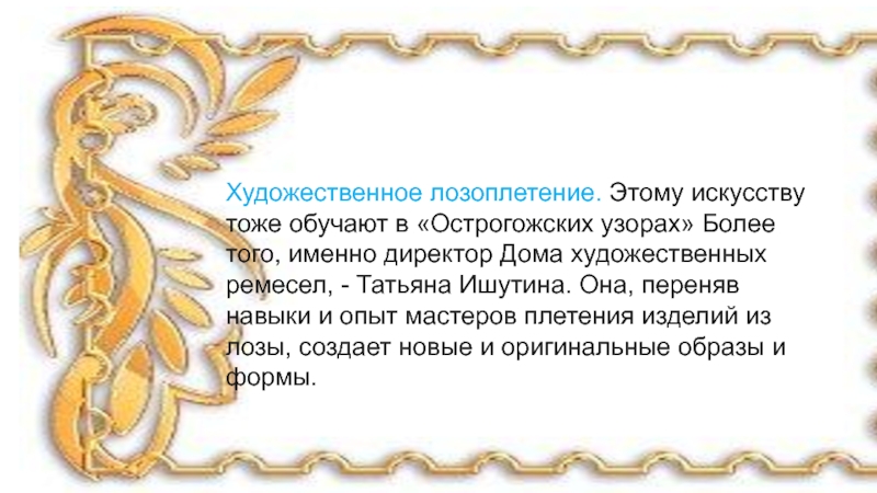 Слайд 8Художественное лозоплетение. Этому искусству тоже обучают в «Острогожских узорах» Более того,