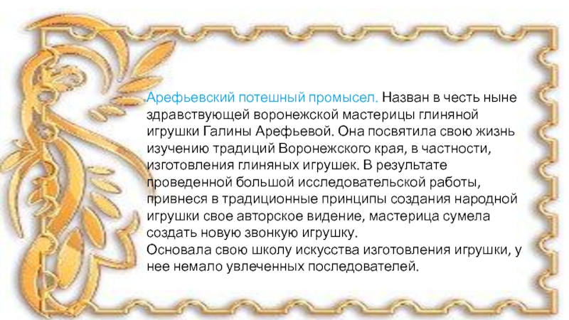 Слайд 2Арефьевский потешный промысел. Назван в честь ныне здравствующей воронежской мастерицы глиняной