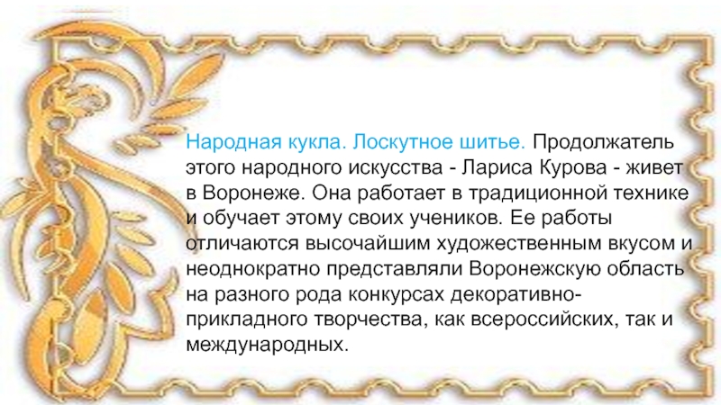 Слайд 12Народная кукла. Лоскутное шитье. Продолжатель этого народного искусства - Лариса Курова