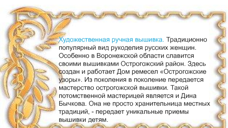 Воронежской области славится своими вышивками Острогожский район. Здесь создан и работает Дом ремесел «Острогожские узоры». Из поколения в поколение передается мастерство острогожской вышивки. Такой потомственной мастерицей является и Дина Бычкова. Она не просто хранительница местных традиций, - передает уникальные приемы вышивки детям.