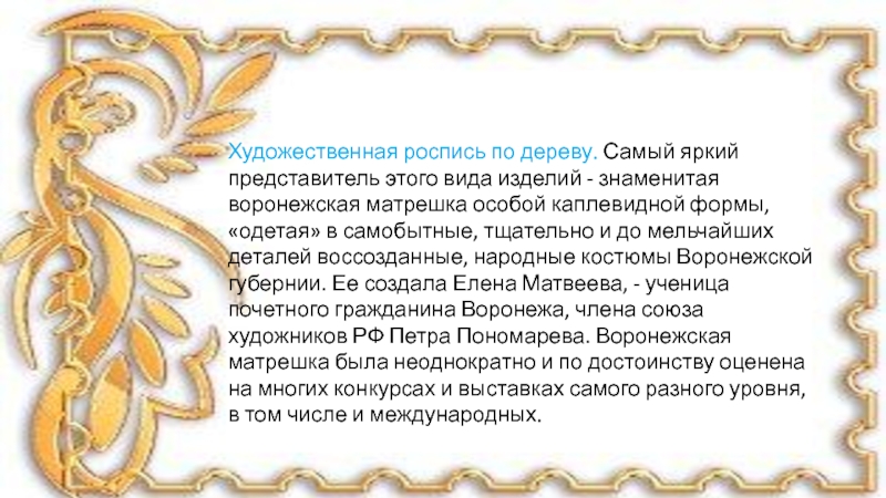 Художественная роспись по дереву. Самый яркий представитель этого вида изделий - знаменитая воронежская матрешка особой каплевидной формы,