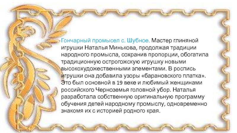 народного промысла, сохранив пропорции, обогатила традиционную острогожскую игрушку новыми высокохудожественными элементами. В роспись игрушки она добавила узоры «барановского платка». Это был основной в 19 веке и любимый женщинами российского Черноземья головной убор. Наталья разработала собственную оригинальную программу обучения детей народному промыслу, одновременно знакомя их с историей родного края.
